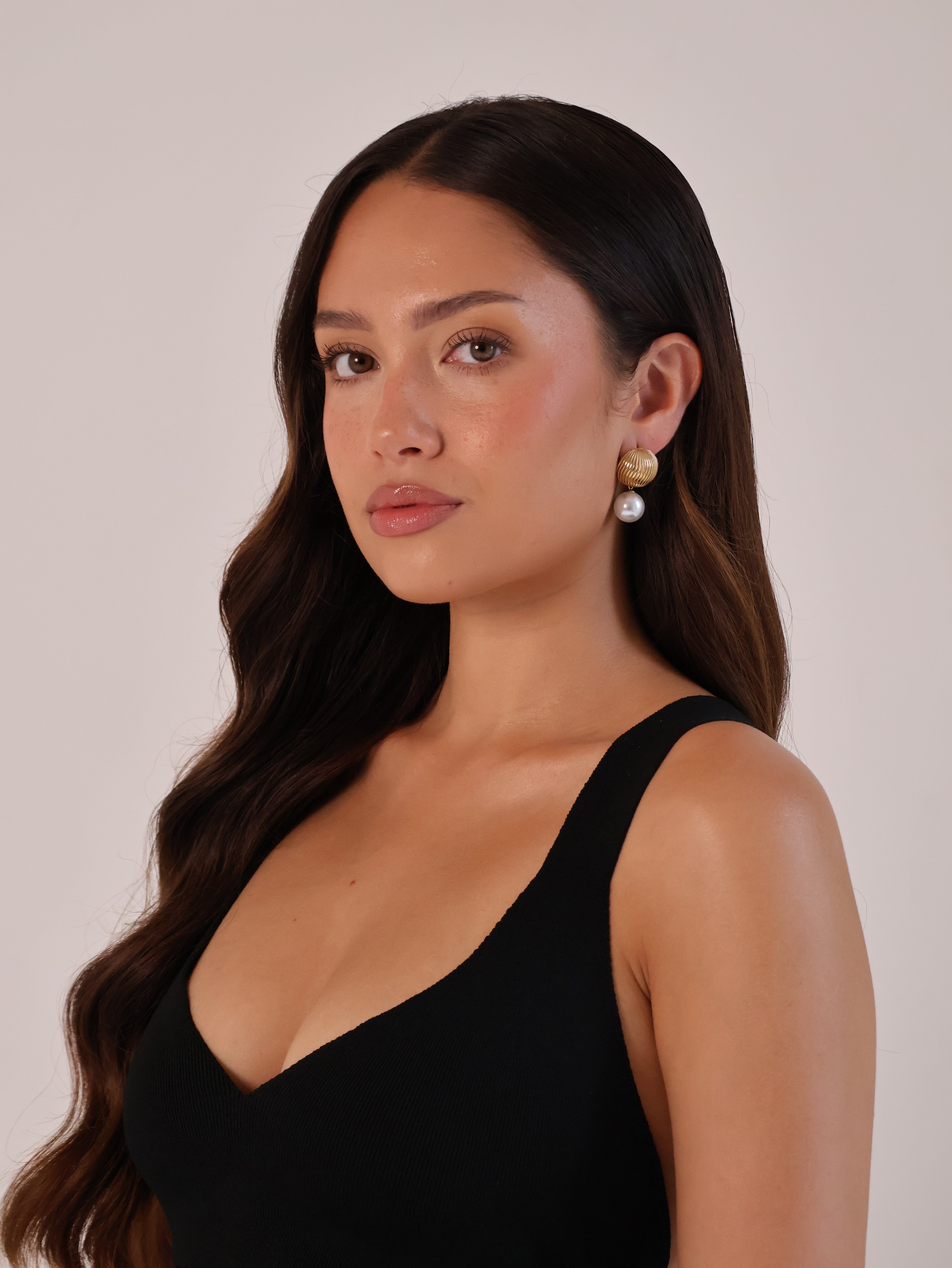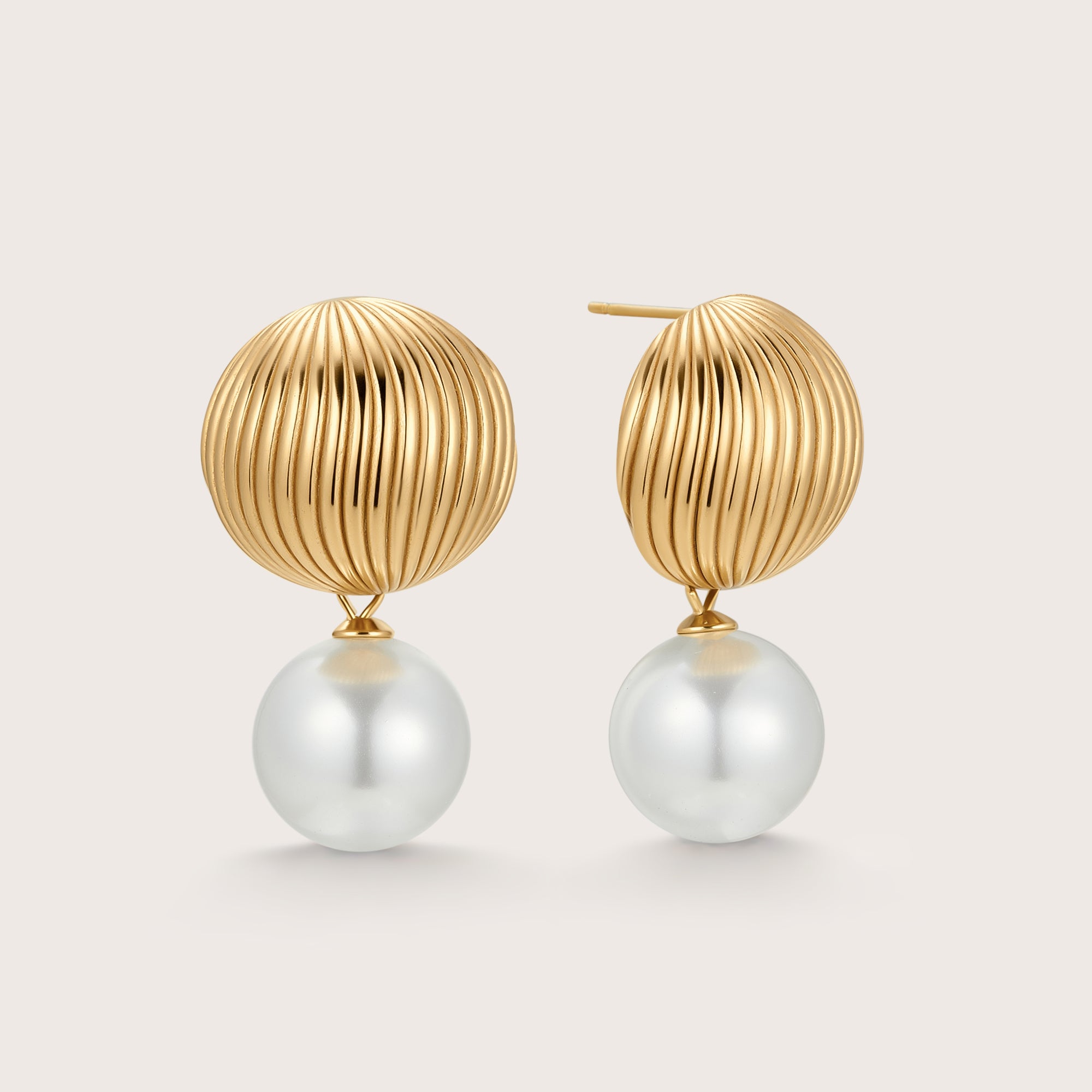 The balloon pearl earrings feature a gold carved balloon and a dangling pearl.