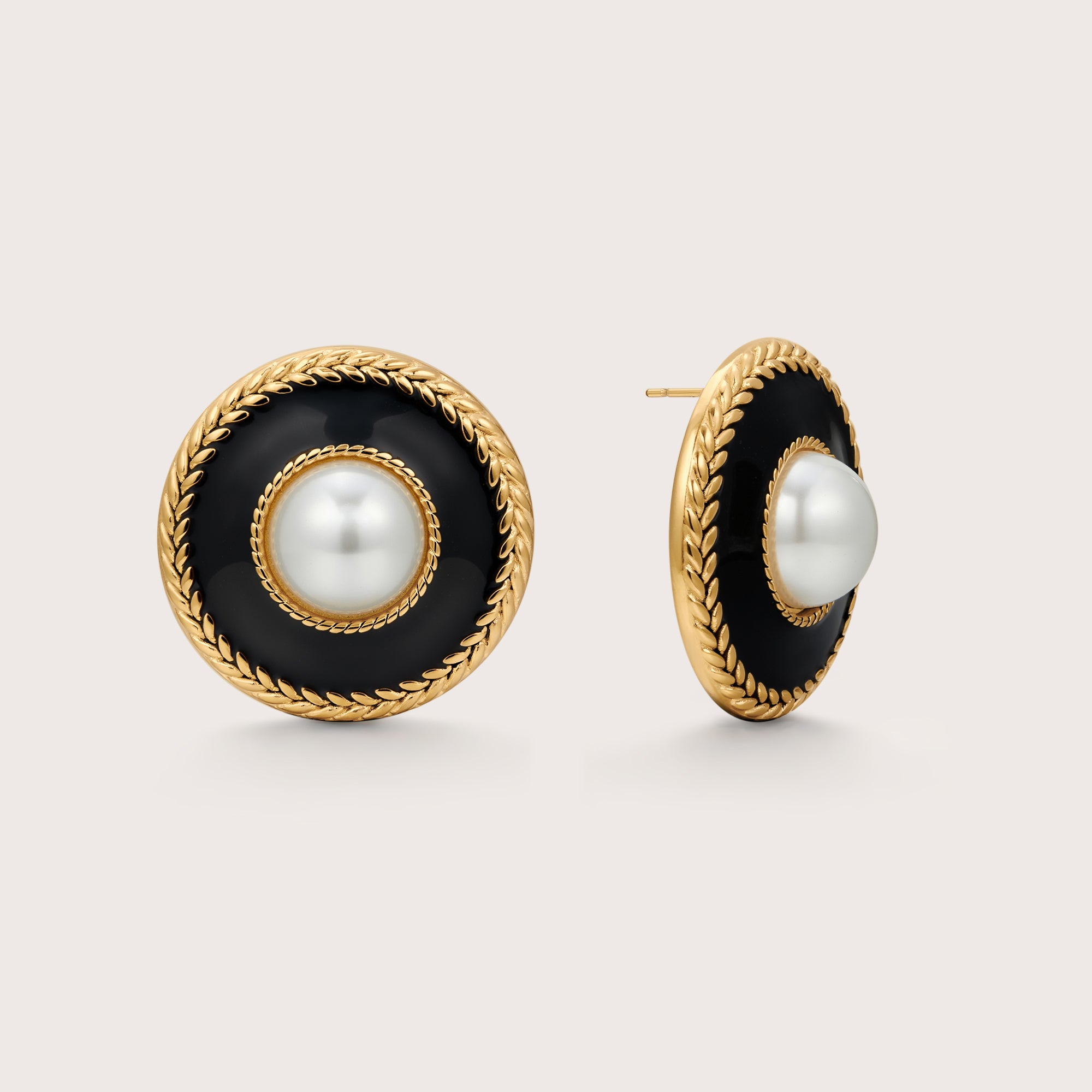 Vintage inspired, the braid pearl earrings feature a faux pearl surrounded by resin and finished with a braided gold detail.