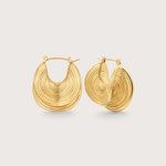 The fold hoop earrings feature ribbed carving and a unique fold design.