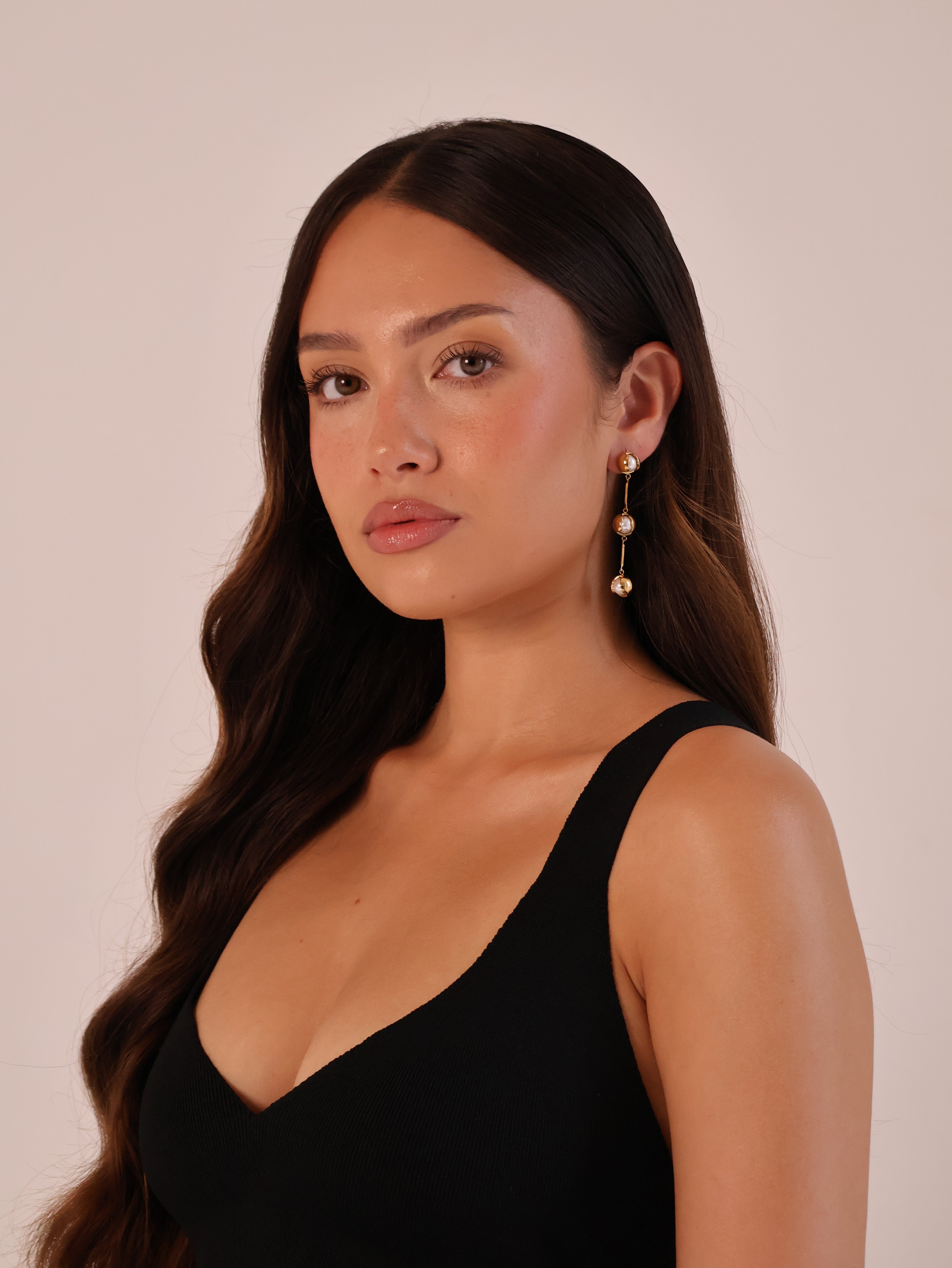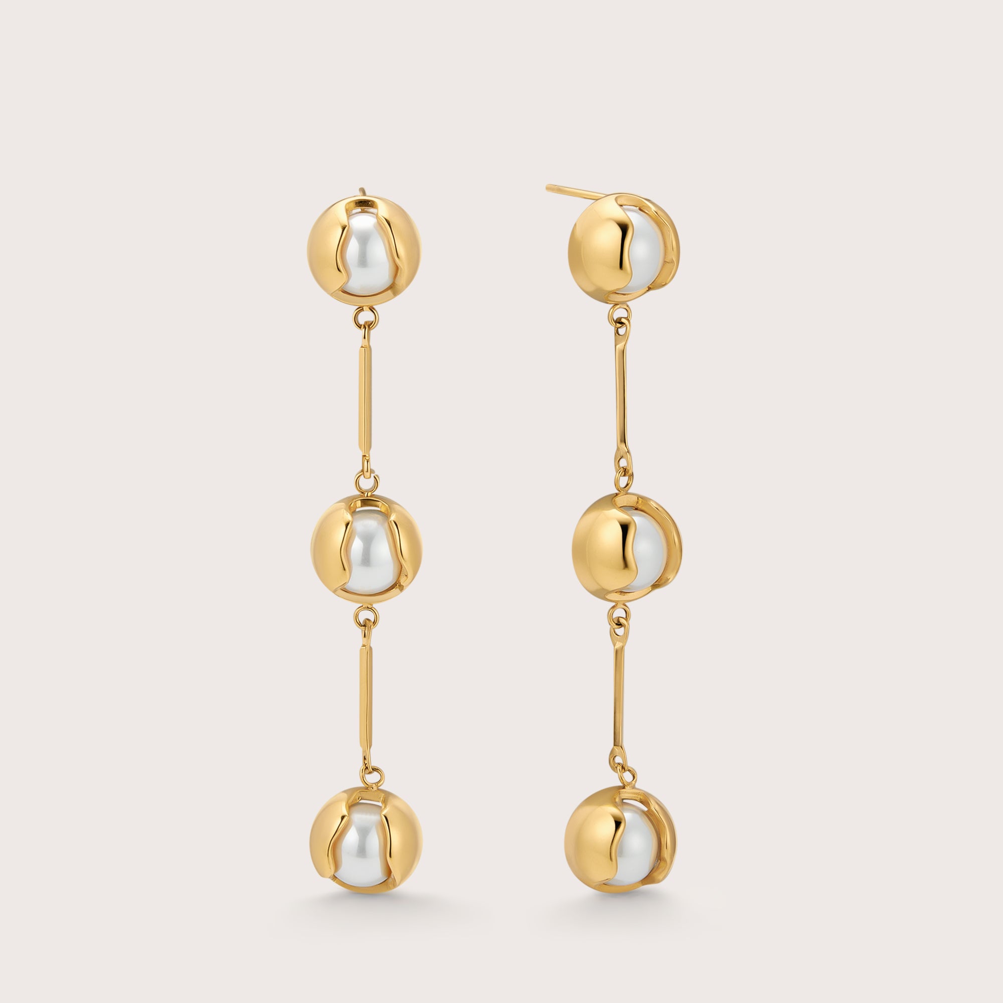The pearl drop earrings are crafted with unique iridescent faux pearls and feature a high polish gold finish.