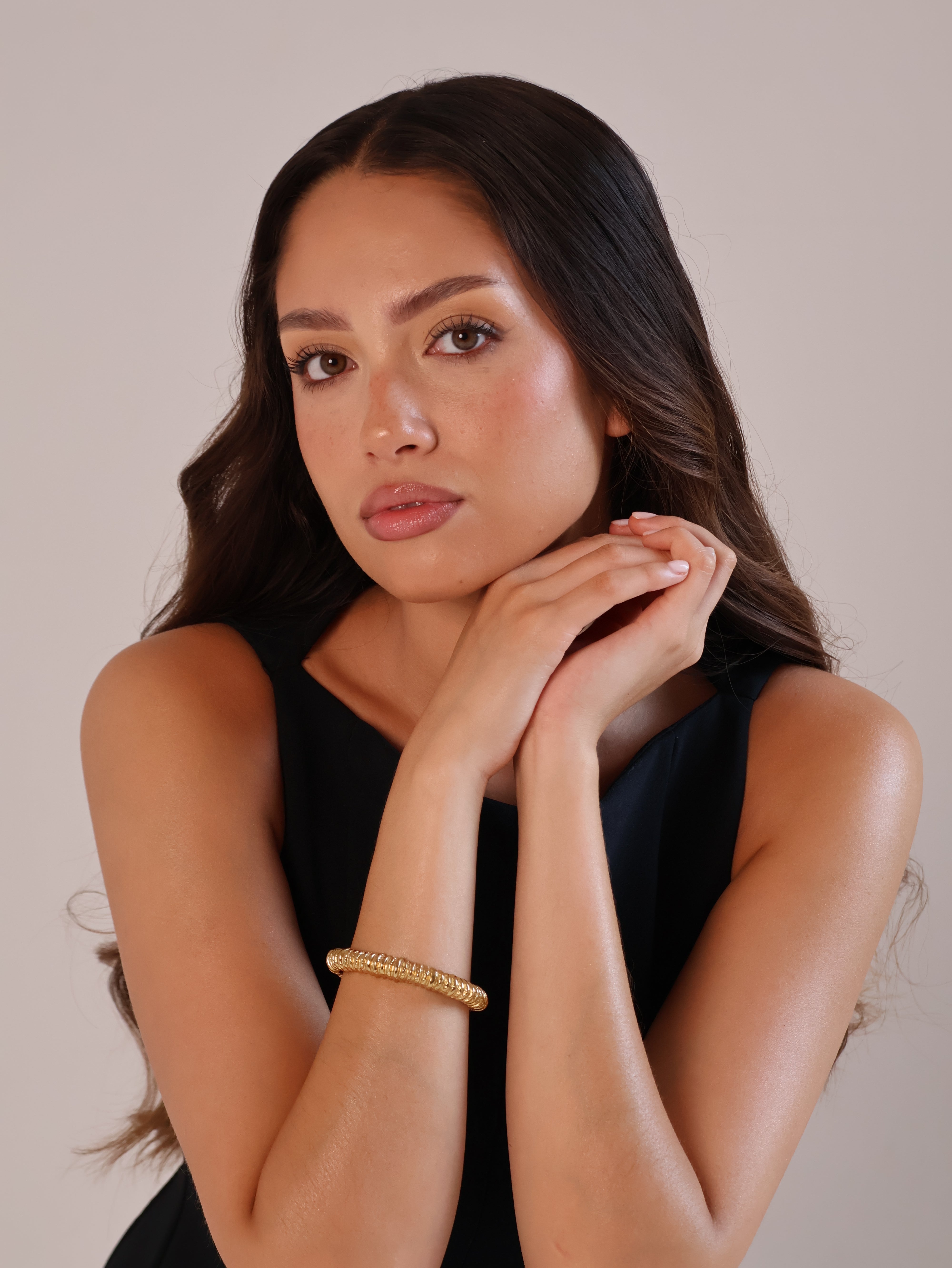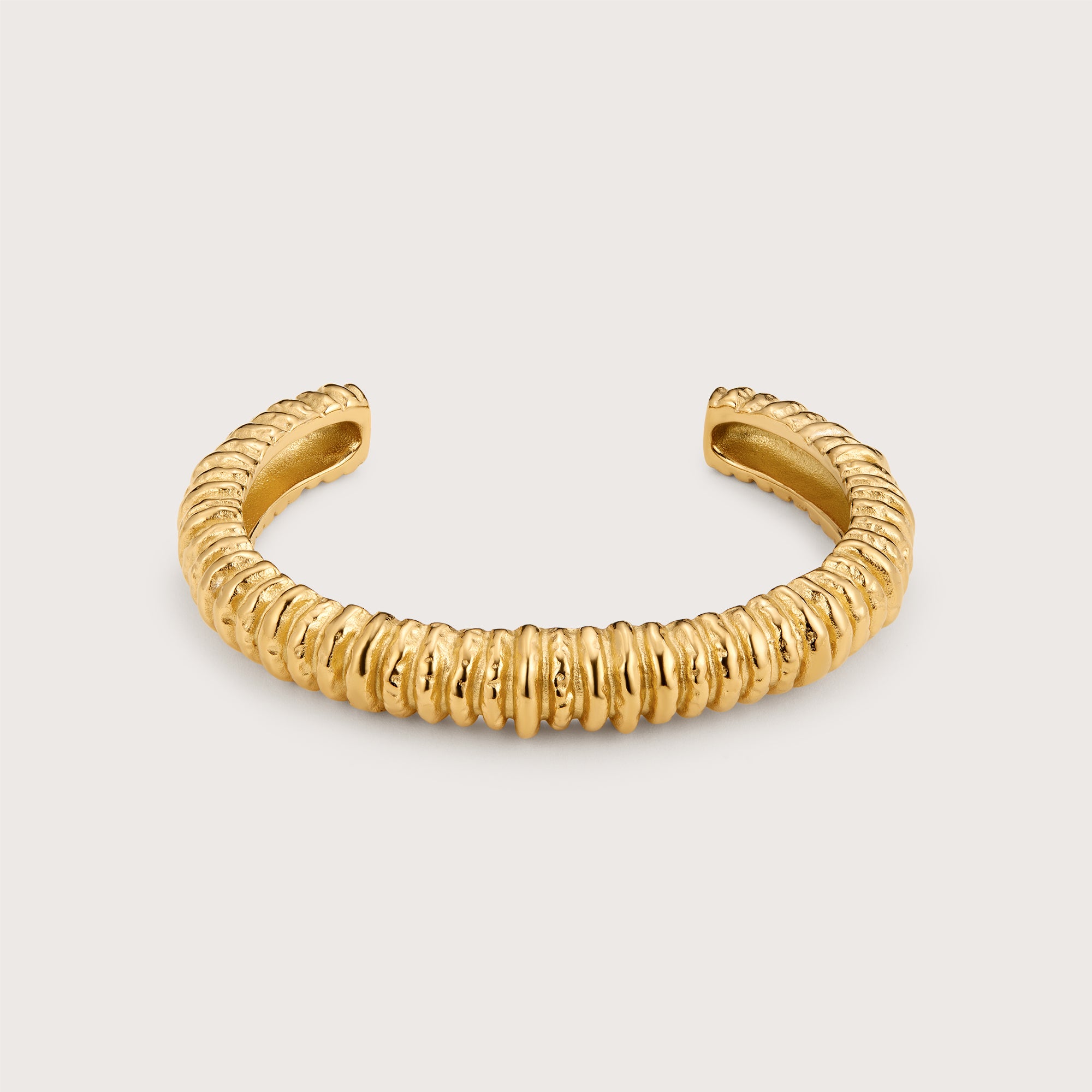 Solid bangle bracelet featuring an asymmetrical ribbed pattern.
