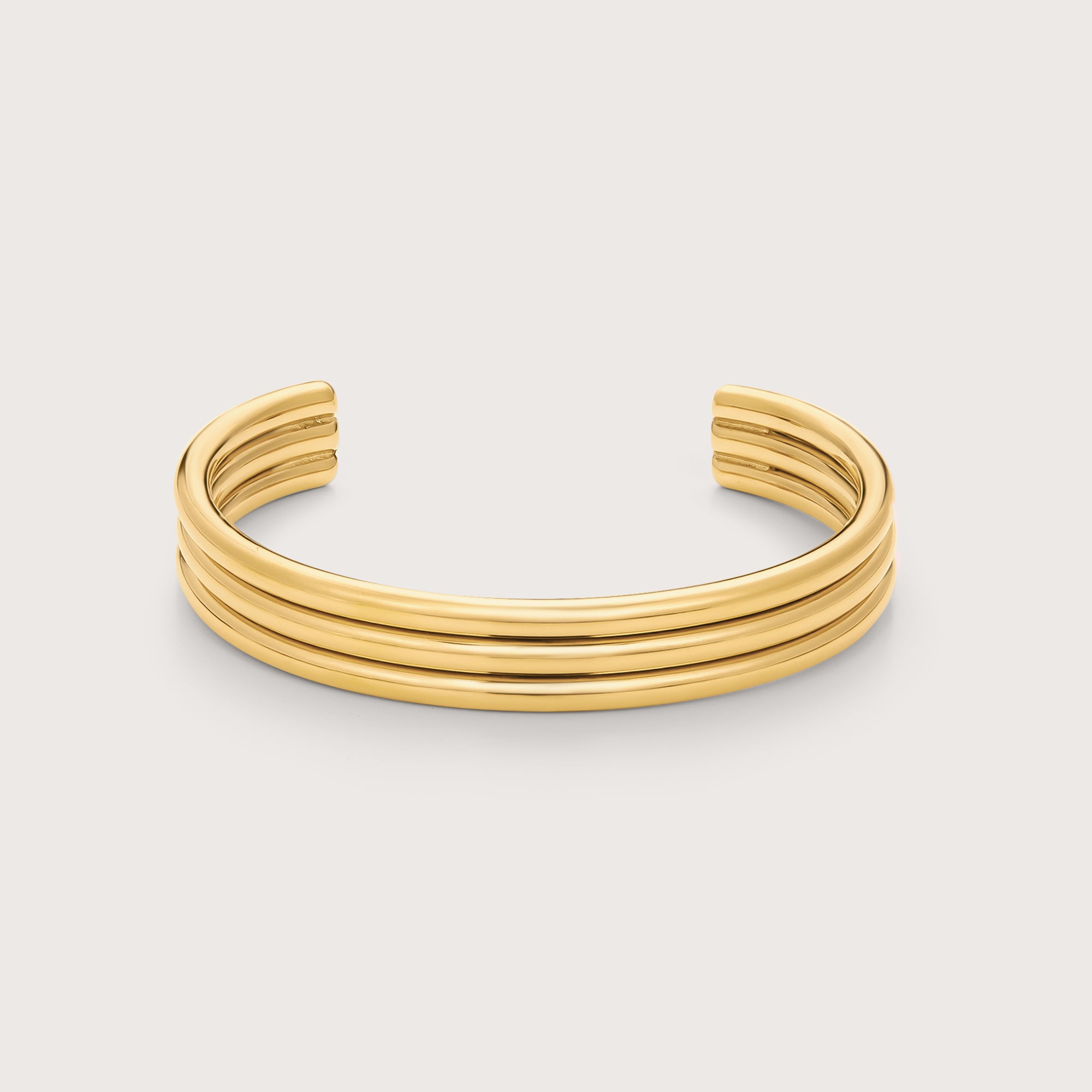 Three slim gold band bracelets bound together to create an elegant statement piece.